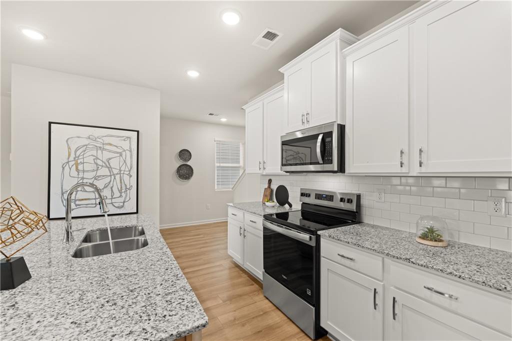Come visit the beautiful Walden Park - The Retreat and explore our Rosedale "G" model-a stunning three-bedroom, two-and-a-half-bath single-family home with a spacious two-car garage and cutting-edge smart home features. You'll be delighted by its upscale finishes, including 42-inch kitchen cabinets with crown molding and pulls, a stylish tiled backsplash, and elegant granite countertops. The owner's suite offers a private retreat, featuring a spacious walk-in closet and a spa-like bathroom with an oversized shower and elegant finishes. Two additional generously sized bedrooms provide comfort and versatility, perfect for family, guests, or a home office. Claim the keys to this lovely home and embark on a journey filled with modern indulgence including state of the art smart home technology. At this price, it won't last long! The Retreat at Walden Park, residents enjoy resort-style amenities, including a swimming pool, cabana, playground, and dog park. The community is conveniently located near shopping, dining, and major highways (I-75 & I-285), making commuting a breeze. Refined renderings do not fully reflect the final product.